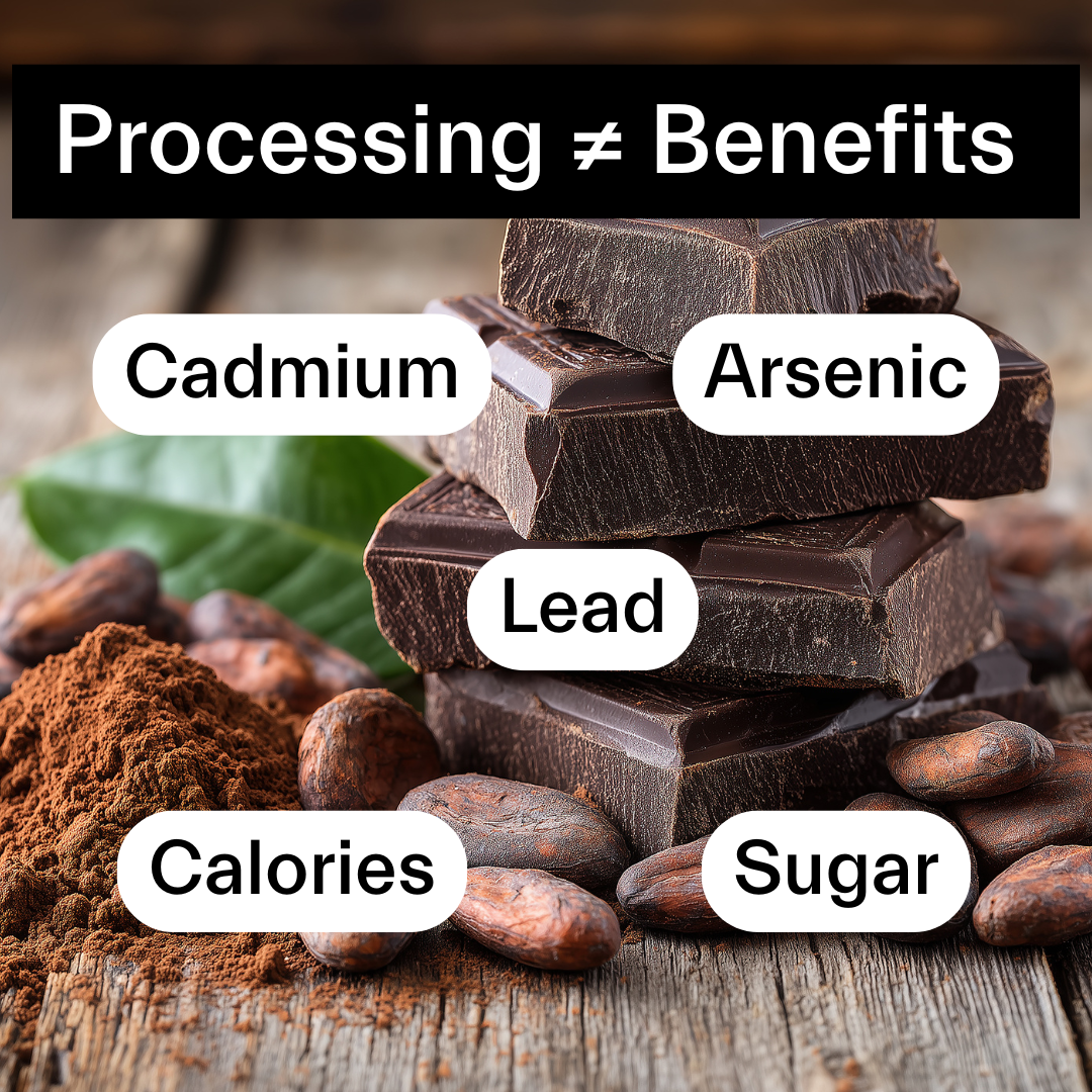 Higher cacao does not solve the problem either. Processing often strips away the flavanols people are chasing, leaving heavy metals, calories, and sugar for very little return. And because cocoa is usually a daily habit, smoothies, drinks, desserts, or a square or two at night, small exposures can quietly add up over time.